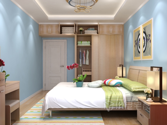 7字型的到頂大衣柜滿足主人的收納需求。百葉門板使得整個臥室提升了一個檔次。