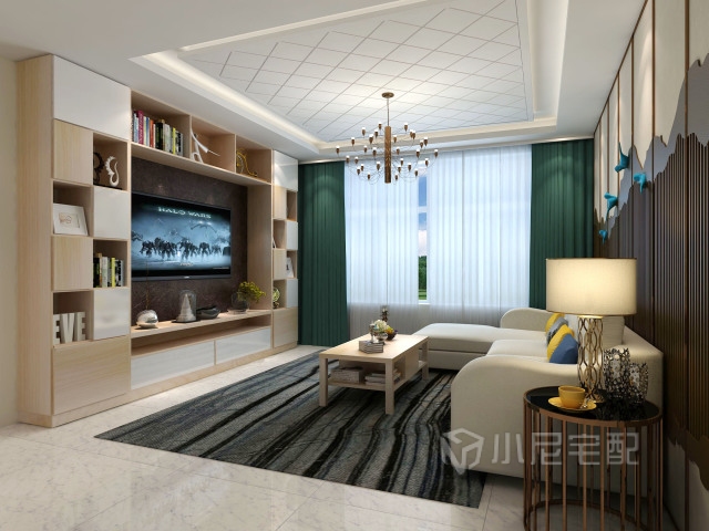 整面墻的電視柜帶來超大儲物空間,開放式與封閉式結(jié)合,有露有藏。