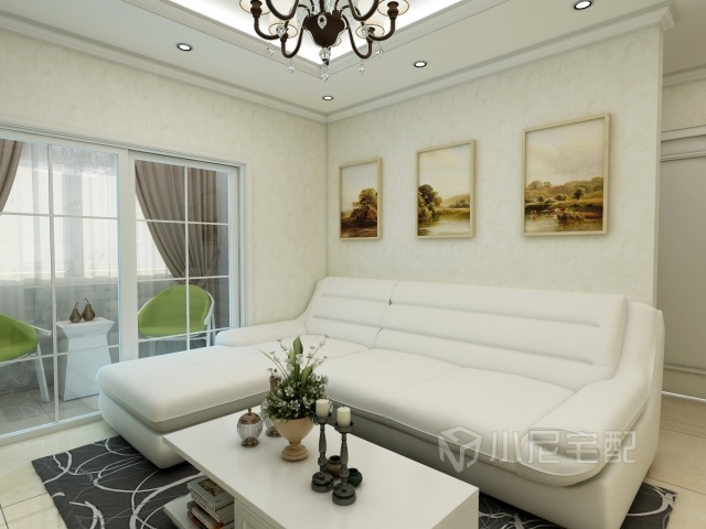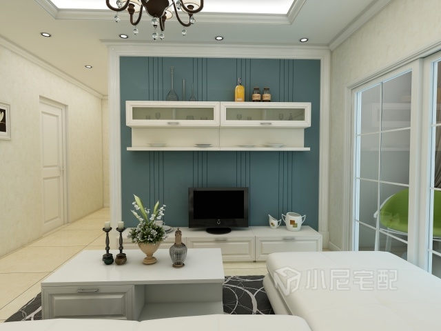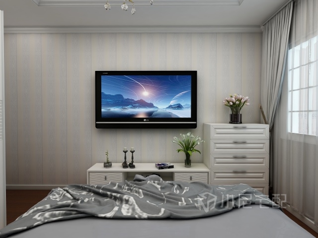電視背景墻采用深色系與潔白的家具形成對比使整個空間更加明亮美觀