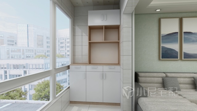陽臺做個(gè)柜子,增加了收納空間。柜子上面寬度做小,也不影響窗戶打開。