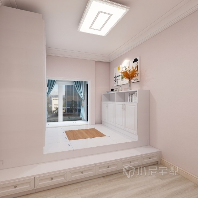 次臥榻榻米連著陽臺。衣柜,書柜,升降機,收納空間充足,同時也是休閑喝茶的好地。