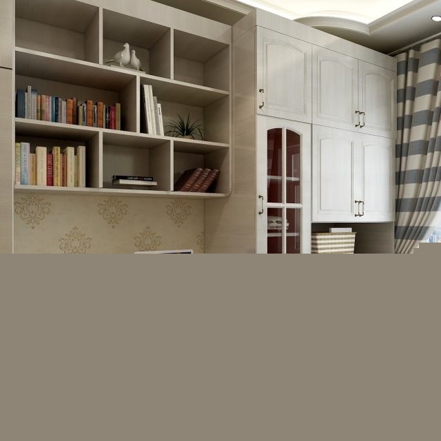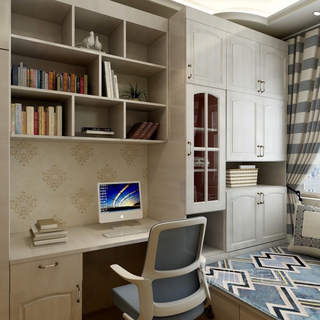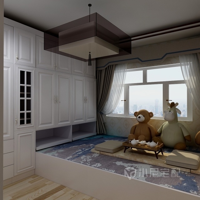 榻榻米加衣柜和書桌書架,合理利用空間,顏色是淺色木紋系列,溫馨不失莊重,有文化氣息。