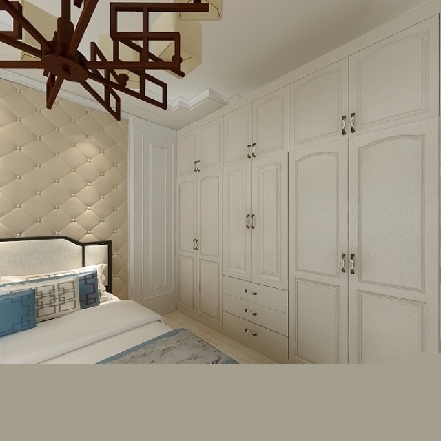 次臥,炕床加整體衣柜。以純白色為主,雖然做了滿屋的柜子,但是顏色清亮,不會顯得擁擠。