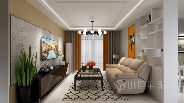 客廳的沙發(fā)是男主人的最愛,在此基礎上搭配木飾面板和文化石作為背景墻,整體簡約又不乏時尚。