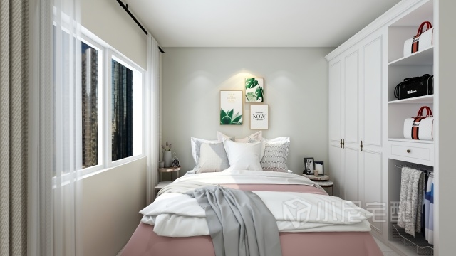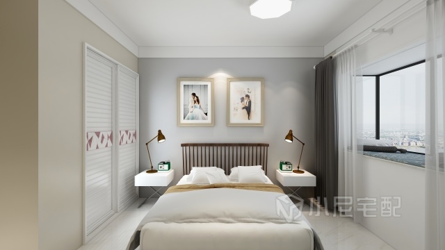 主臥則滿足了女主人的喜好,偏北歐的極簡風格。裝飾的照片為兩個人的婚紗照、流漏出一絲絲的溫馨情感。