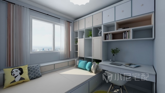 書房暫定為休息區(qū),平常女兒可以用來寫作業(yè)學習,男主人也可以用來辦公