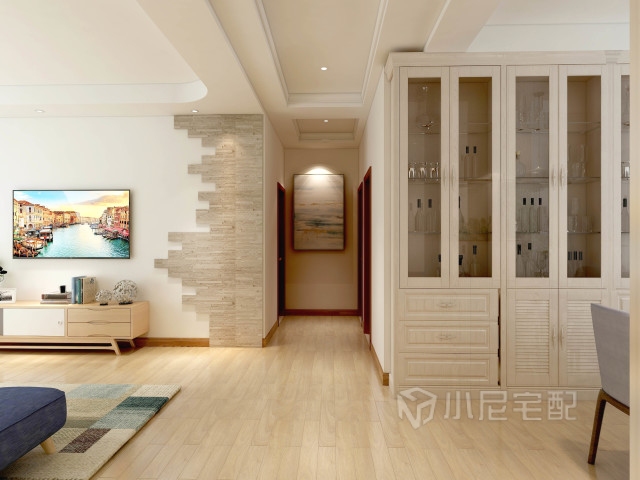 客廳背景墻選用的是實(shí)木貼皮,以不規(guī)整的造型增加趣味性,吊頂?shù)膱A弧造型與簡約風(fēng)更加契合,加以自然光的照射給人強(qiáng)烈的色彩沖擊力