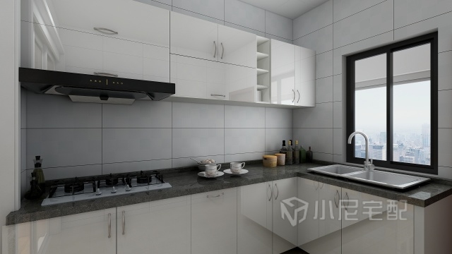 整個空間門板柜體采用的是亮白色的門板搭配黑色石英石,使得整個廚房干凈又明亮