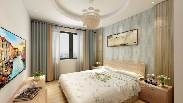 丹麥暖陽系列的床品與灰藍(lán)色窗簾的搭配冷暖相襯,層次分明