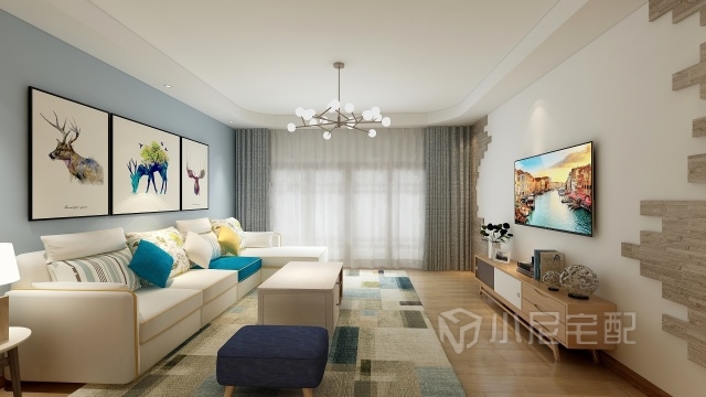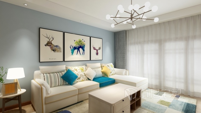 用小尼沙發(fā)色彩飽滿度較高的靠墊抱枕搭配以干凈明亮的茶幾以及淺孔雀藍(lán)的沙發(fā)背景墻,令整個客廳空間鮮亮。