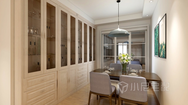餐廳酒柜的設(shè)計(jì)是金絲胡桃的柜體 跟整個空間的顏色相協(xié)調(diào),餐廳掛畫的位置是點(diǎn)睛之筆