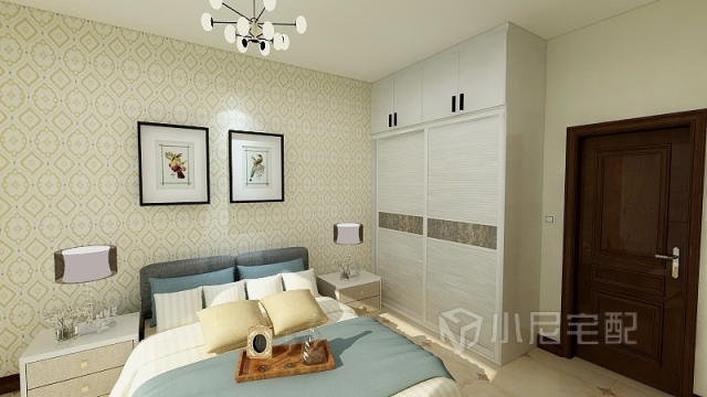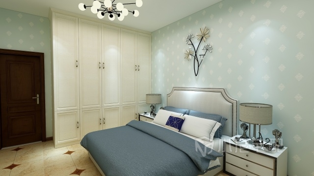 主臥室小尼宅配定制的衣柜給了主人很大的儲物空間,淡淡的藍(lán)色墻紙顯得整個房間舒適而透亮。