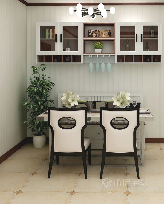 餐廳用小尼宅配定制一組掛墻式酒架,精巧實用,顏色和餐椅很搭,都用的深淺撞色。