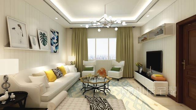 客廳用黃綠色搭配整個淺色空間既舒適又活潑,電視墻尺寸較小,用簡潔的電視柜和掛墻吊柜就有了造型感。