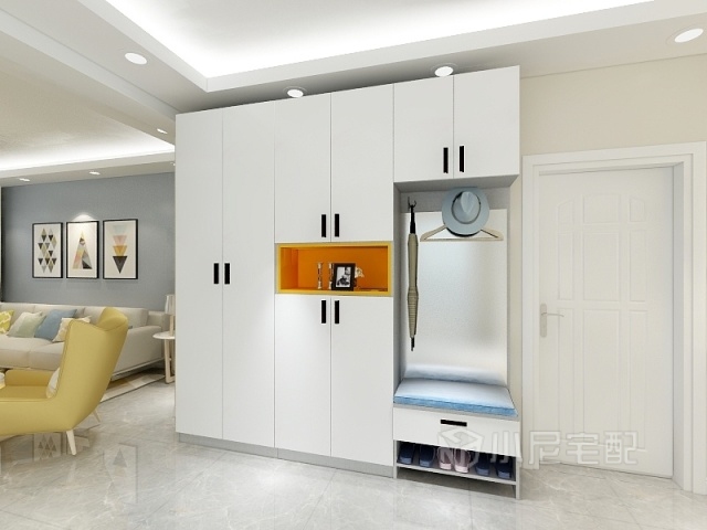 門廳鞋柜業(yè)主想要一個儲物功能多一些的,整體灰白搭配,其中檸檬黃的開放格是整體的點睛之筆,讓整個空間顯得青春洋溢。