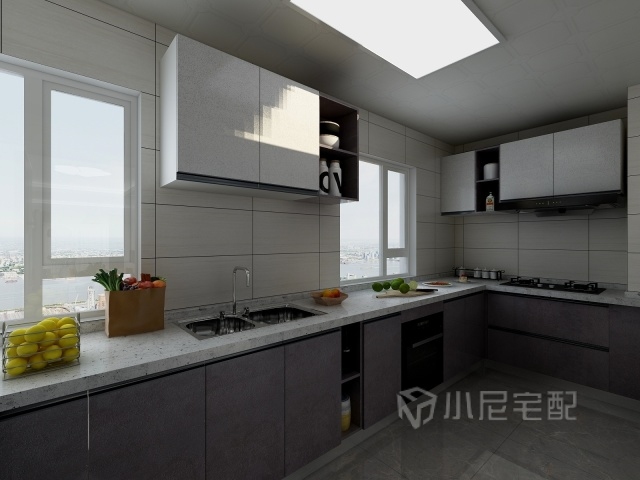 廚房整體選用了灰白搭配,相較于黑色,灰色和白色更為柔和,顯得更加的大氣。