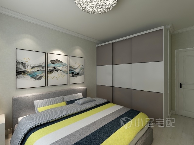 為了不讓空間看起來(lái)過(guò)于沉穩(wěn),選擇灰色的床,造型簡(jiǎn)約的床頭燈,進(jìn)行視覺(jué)中和作用。顯得特別的溫馨