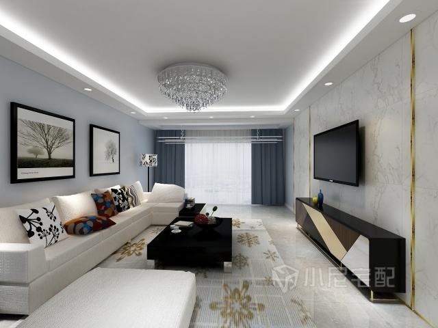 柔和的晨光從窗戶(hù)灑進(jìn)來(lái),坐在舒適的布藝沙發(fā)上靜靜的看一本書(shū)亦或是和家人說(shuō)笑。電視背景墻采用了石材加上金屬線條,給人眼前一亮的感覺(jué)。
