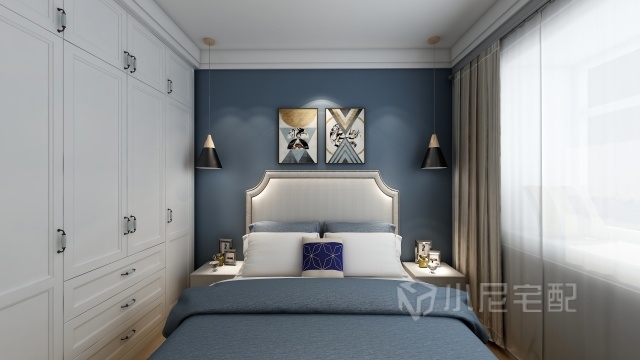 臥室采用藍(lán)色的背景墻,顏色的搭配上舒適又安逸。