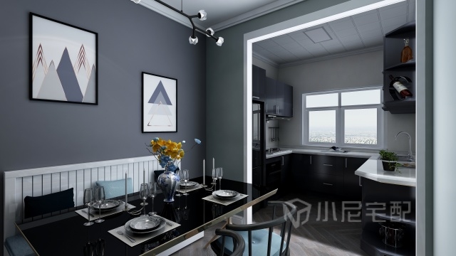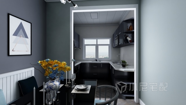 本案的餐廳設計亮點便是噴花茶鏡,以及吊頂。與客廳的設計合二為一,相互呼應。還運用兩幅現(xiàn)代掛畫,更符合現(xiàn)代人的審美品位。餐廳中設置了吧臺,可以點綴餐廳的空間,同時也提高了主人的品味。