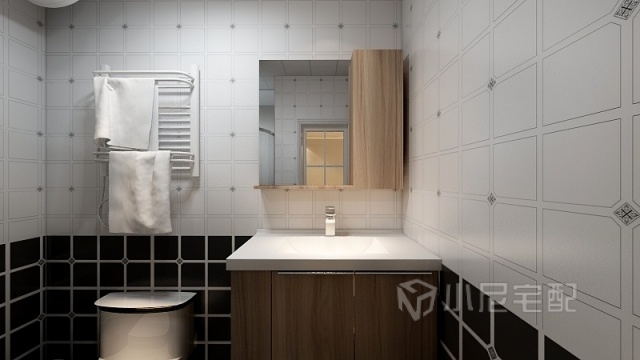 原木色的浴室柜搭配黑白磚