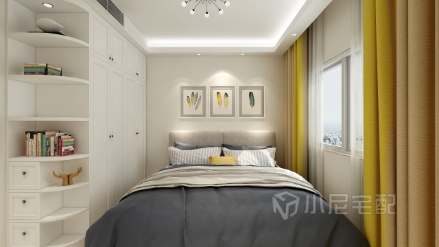 臥室整體灰色相呼應(yīng)亮黃色點綴