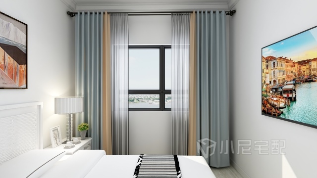 次臥淡藍(lán)色窗簾配合白色精品床飾,一切都以簡(jiǎn)潔為主