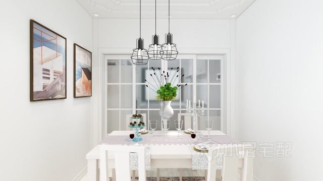 白色配套餐桌加上綠色植物花瓶點(diǎn)綴,墻面暖色裝飾畫讓人食欲大增