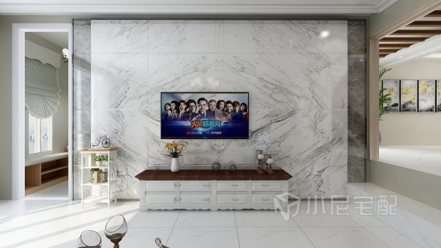 客廳因?yàn)槭莿e墅的原因所以較高,選用大理石背景墻可以提亮空間,簡(jiǎn)約大氣