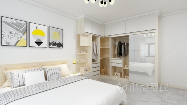 主臥室進門處放個圓角衣柜,進門顯得舒適,配合原木色床套整個屋子一切簡潔為主