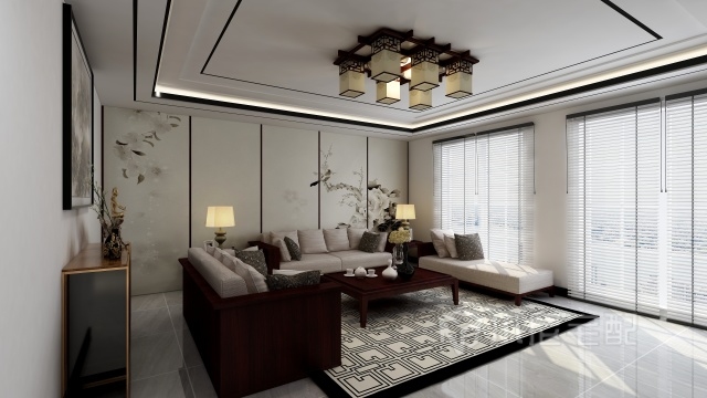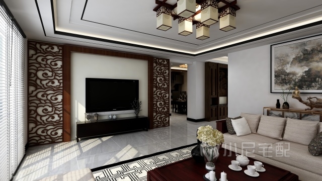 沙發(fā)背景以畫為墻,窗簾用卷簾,可以從視覺上增加客廳的面積。實木軟靠沙發(fā)更顯檔次