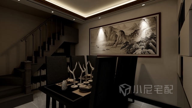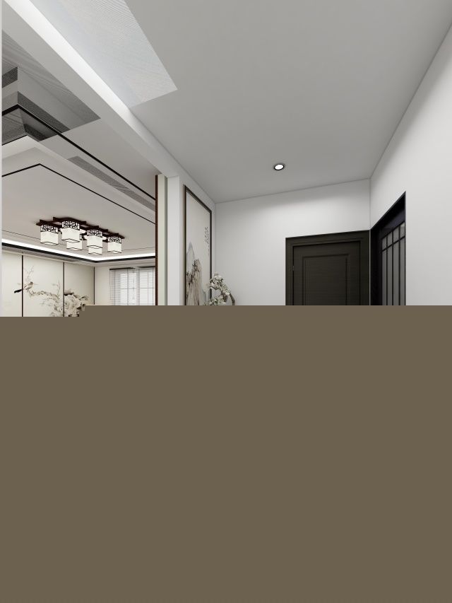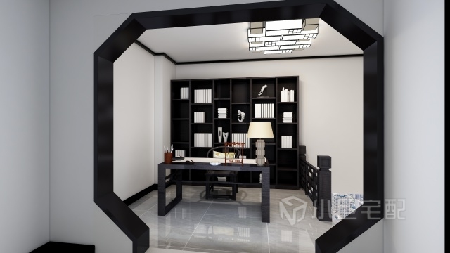 二樓樓梯口處是主人書房位置,為增加設計感,將過道門洞加寬,造型改為八角窗,顏色采用黑白搭配,有徽派建筑的影子