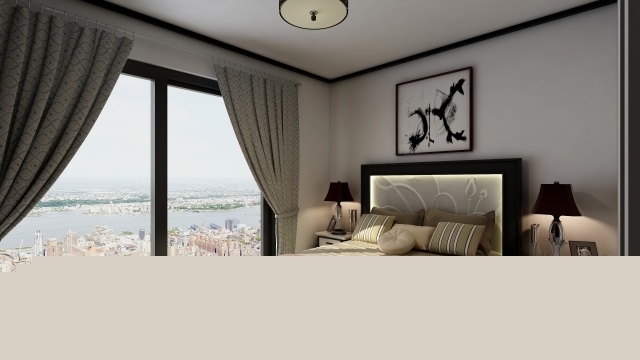 主臥整體顏色為黑白色,模仿徽派建筑的感覺,新中式的實木床,穩(wěn)重大氣