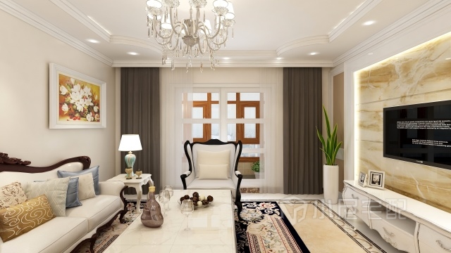 客廳大理石背景墻配合白色烤漆邊框,吊頂采用歐式大樣石膏線,一切盡顯豪華范