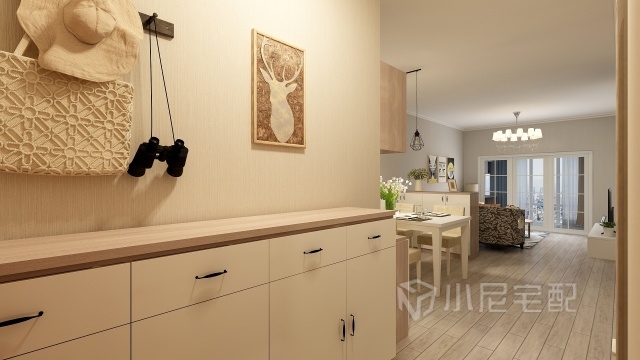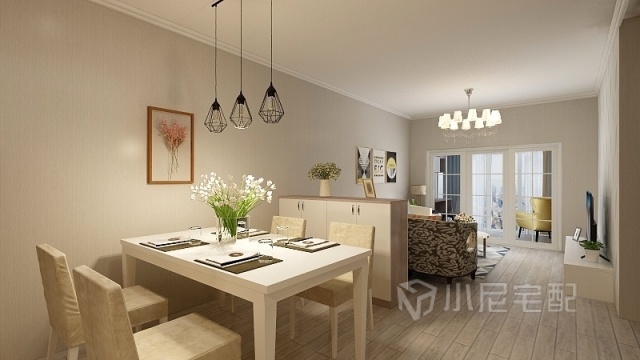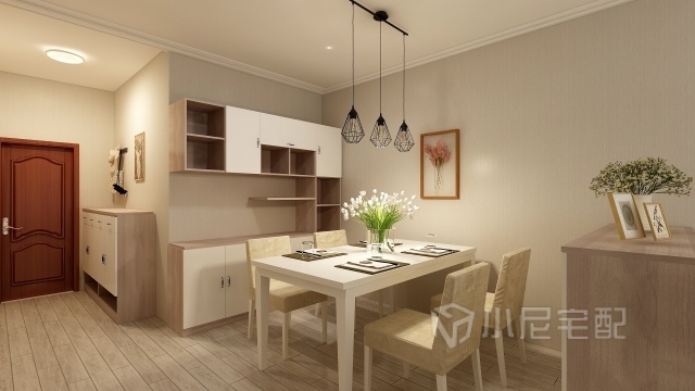 半高柜將餐廳和客廳分隔開,增加收納空間,同時統(tǒng)一風(fēng)格