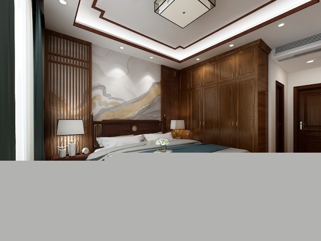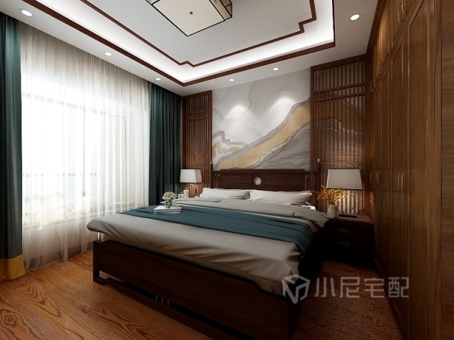 主臥室的背景墻用木質的花格搭配抽象圖案的壁畫,讓空間具有了視覺焦點。