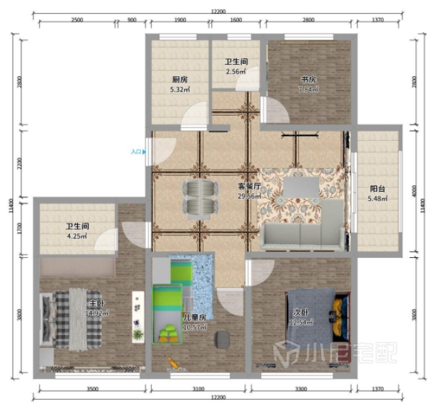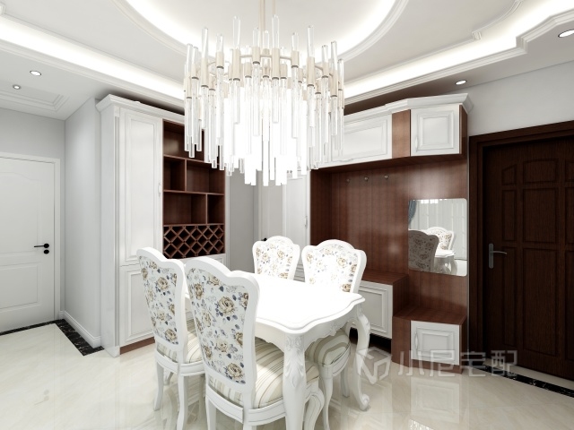 客廳選用的是簡歐設(shè)計(jì),使用深胡桃柜體和白木紋門板套色,門廳鞋柜和餐邊柜