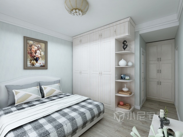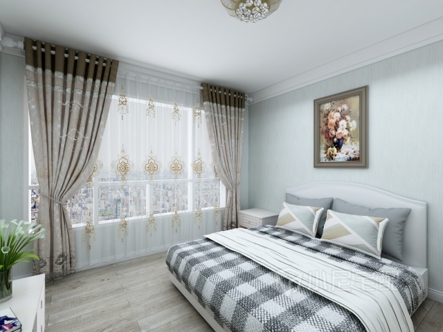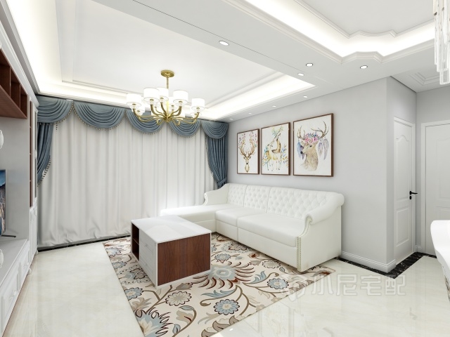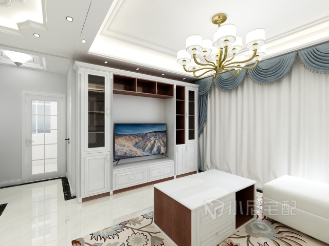 客廳選用的是簡歐設(shè)計(jì),使用深胡桃柜體和白木紋門板套色