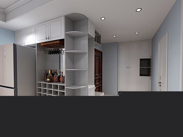 進門左側(cè)為夏季長裙,秋冬季長款衣物的衣柜,兩個無門柜可以隨手放包包一類的小件。右側(cè)為以換鞋凳為一體的玄關(guān)柜連接餐廳的酒柜