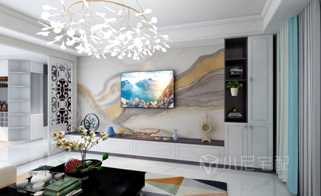 5米的大客廳背景墻為大理石雕刻花紋配輕奢款定制電視柜,外邊買不到的專款專用電視柜。