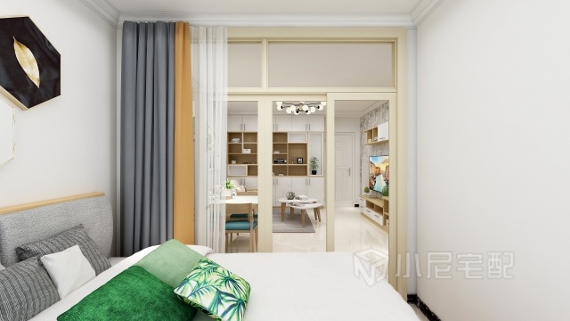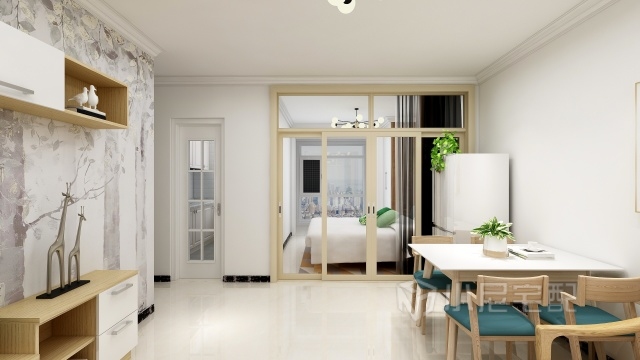 次臥室用整體推拉門做隔斷,增加客廳采光通風(fēng)