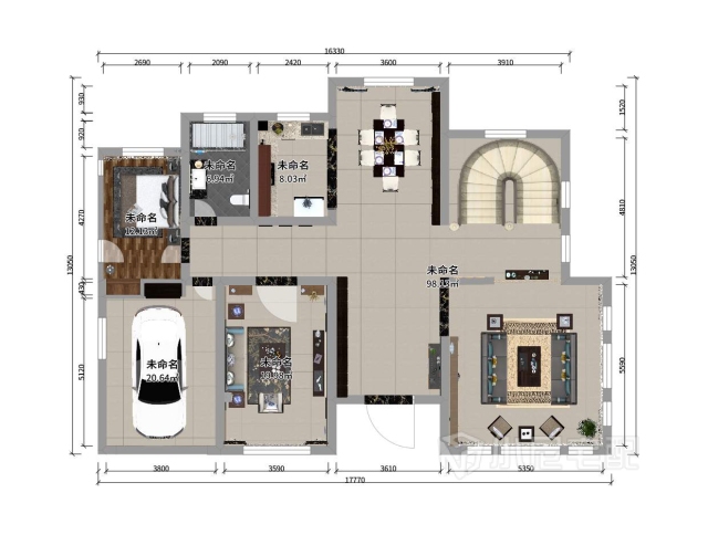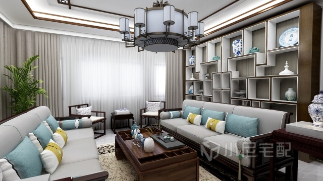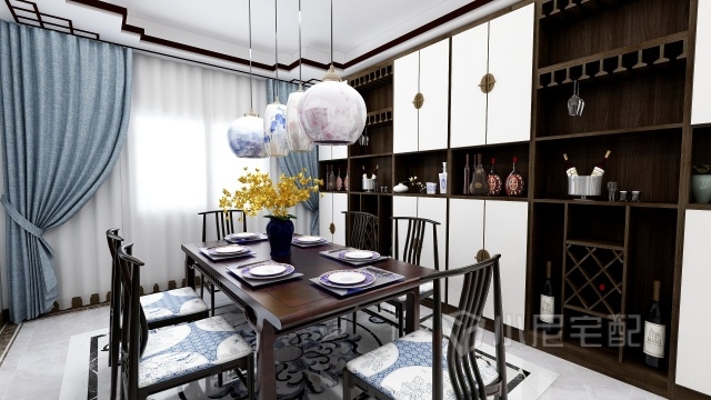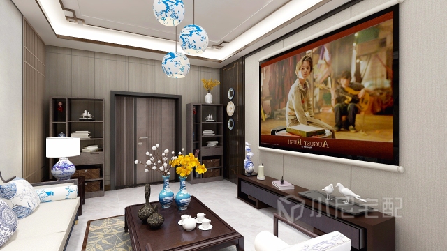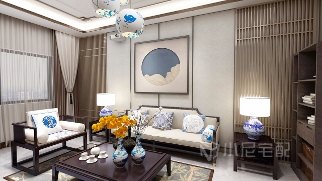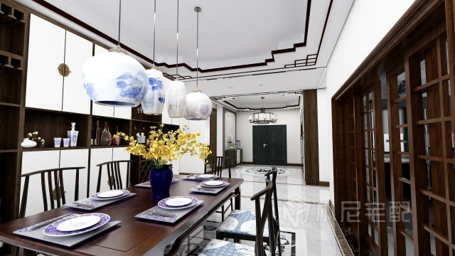 這是一個(gè)以瓷元素為裝飾元素的新中式風(fēng)格的別墅的一層,包括客廳、餐廳、視聽室、廚房、保姆房以及車庫(kù)。