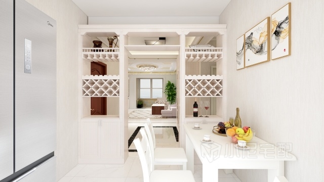 用隔斷將兩個(gè)空間隔開,減小了餐廳的占地也能夠讓小隔斷起到大作用,它同時(shí)起到了餐邊柜的作用。