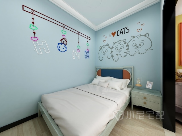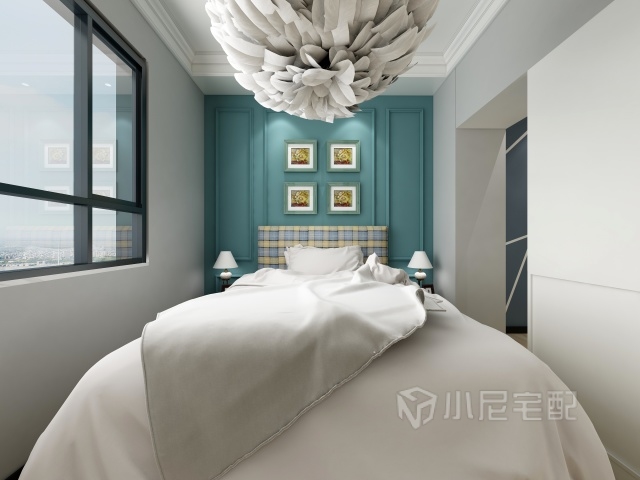 此臥室,看似簡單其實(shí)大有玄機(jī),看到天花板上的燈了么,這可不是一個(gè)簡單的燈,這是一個(gè)羽毛燈,這是一個(gè)吉祥的象征好比白鳥朝鳳這個(gè)燈就是鳳凰。床頭背景那就更不一般了,為什么不一般呢因?yàn)槭撬{(lán)色的。