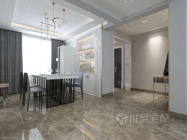 餐廳,黑色現(xiàn)代餐桌陪白色烤漆酒柜,更顯生活恬靜隨意