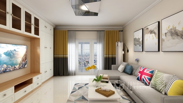 布藝沙發(fā)加滿墻的電視柜適用又美觀