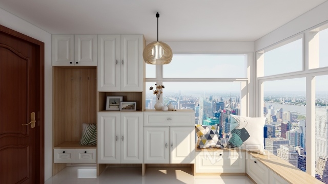 巨大的L型窗子前面加上地柜。上面加上大理石臺面改造成一個巨大的飄窗,超級慵懶能在上面座一下午。