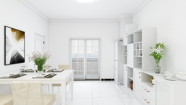 餐廳冰箱處有上水管,所以做階梯狀餐邊柜,既有儲物空間也把管道包里面