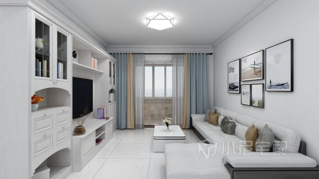 客廳因為女主人喜歡讀書需要書柜,故做電視背景墻連體柜,解決女主人書柜問題增加儲物空間