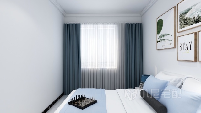 主臥墨藍色窗簾搭配淺藍色床品,簡單 有品位